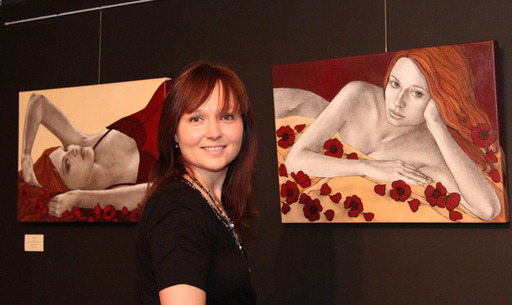 Often walking hand-in-hand with controversy is the sensual female form, Russian born, Belgium based - artist Olga Gouskova certainly knows how to capture an audience with her paintings of beautiful and stylish women. Gouskova's women are sexy, melancholic and mysterious, with a powerful physical intensity and a subtleness of form which almost makes you want to caress them. Her female figures do in fact caress themselves, almost as if to emphasize the preciousness of the female body - the eternal based source of life and love. The sinuous lines in Gouskova's paintings convey vibrations, memories, ambivalent feelings and deep emotion by means of the positions and expressions of the figures.